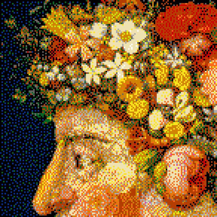 3. アルチンボルド「四季・春」 背景色に黒系の色を3色使い、奥行きを感じられるようにしました。また、花飾りにボリュームを感じられるよう花一つ一つが見えやすいように輪郭を強調するなど工夫しました。
