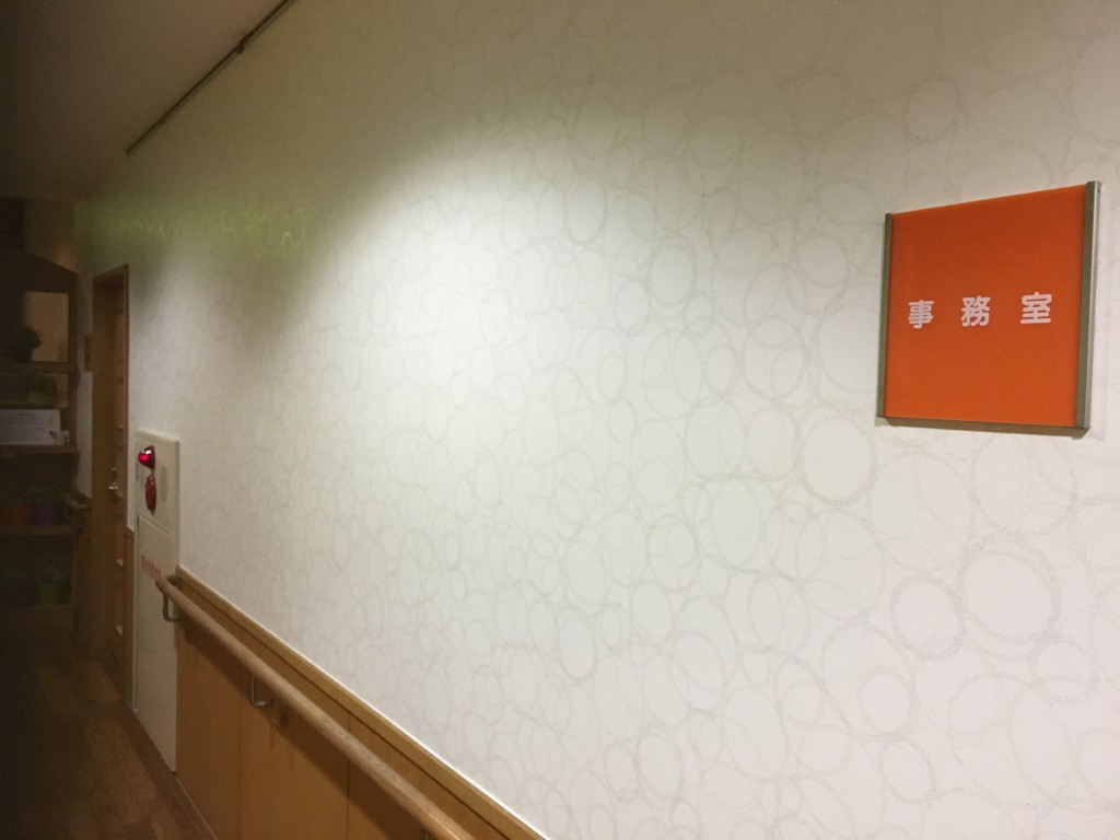 今回の自主改修工事は、共用部分の剥がれて不衛生になっていた壁紙を全面リニューアル。建物は1階から3階までとなっており、本日現在は、1階のデイサービスとお客様を迎え入れるためのエントランス部分が完了しております。